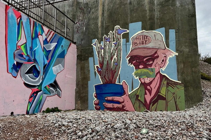 В рамках инициативы «Открытые стены» десять художников молодежного центра «Зеркало» превратили безликие подпорные стенки во дворе дома на улице Алёши Тимошенкова в яркие арт-объекты.
