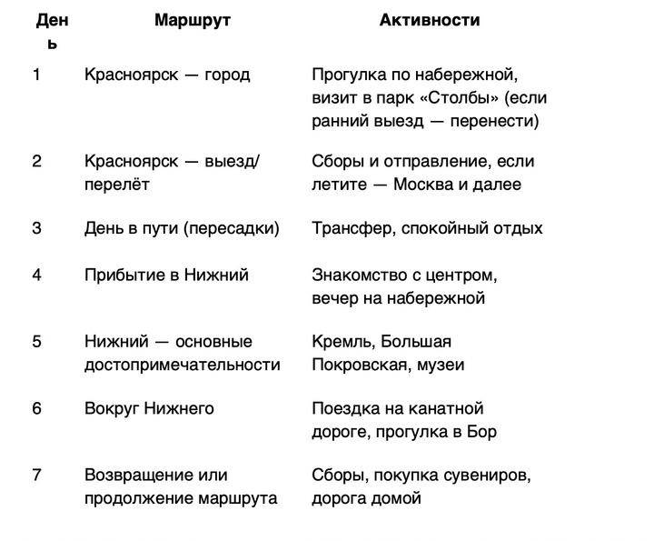 Путешествие между Красноярском и Нижним Новгородом — это способ увидеть крупную часть России на примере двух контрастных городов. Красноярск — город сибирский, суровый по атмосфере и богатый природой вокруг. Нижний — старинный торговый центр у Волги, где история сочетается с уютом набережных. Сравнивать их будет интересно: от скал и тайги к купеческим улицам и речным пейзажам.